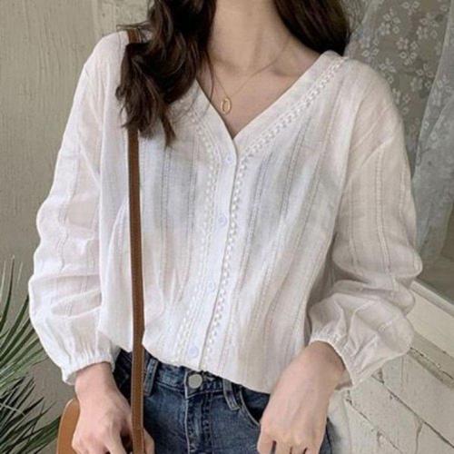 한국 패션 블루 핑크 라펠 셔츠 여성 여름 얇고 시원한 면마 셔츠 프랑스풍 우아한 V넥 긴팔 셔츠 여성용
