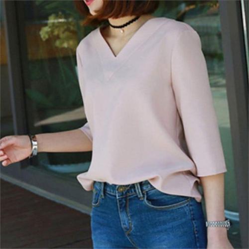 한국 솔리드 컬러 V넥 긴팔 여성 쉬폰 셔츠 봄 가을 우아한 심플 루즈핏 여성 출퇴근 셔츠 신상 128