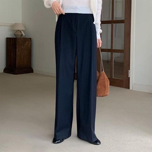 [옷자락] 여성 핀턱 뒷밴드 찰랑 줄무늬 와이드핏 슬랙스