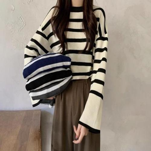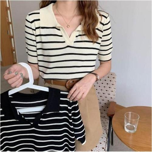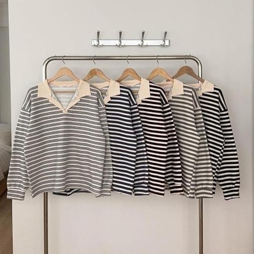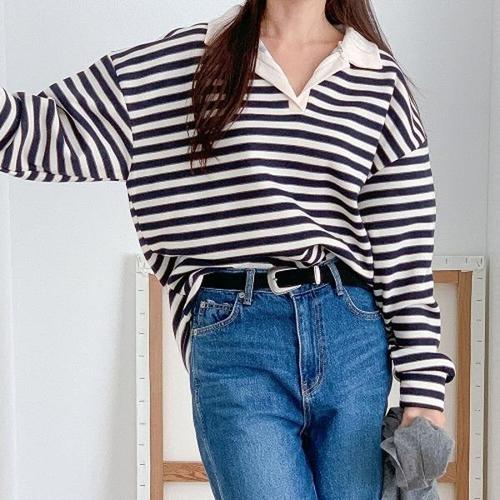 [엄지척]여성 긴팔 스트라이프 카라 니트티 줄무늬티_19629172_667501