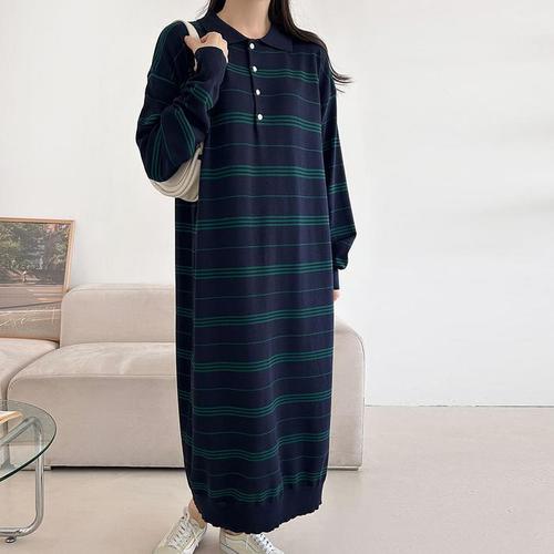 [다잇템][다잇템] 여자 스프라이프 부드러운 스웨터 단추 카라넥 롱원피스_24422443_588872