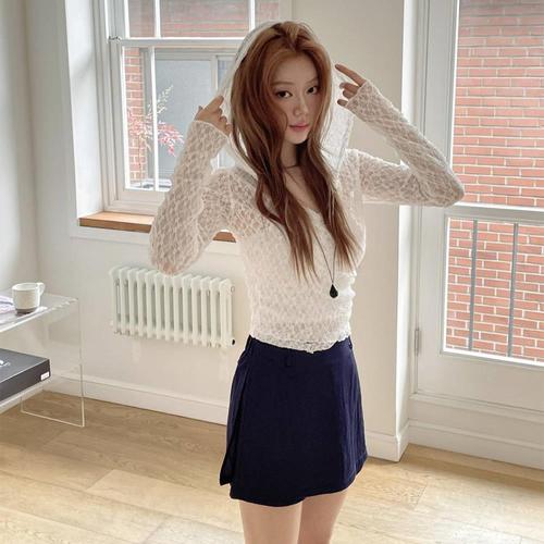 [옷자락] 여자 슬림핏 봄신상 시스루 레이스 후드 긴팔티