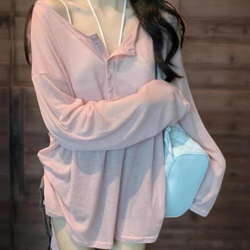 [미라클세븐]여성 오버사이즈 시스루 롱슬리브 버튼 티셔츠