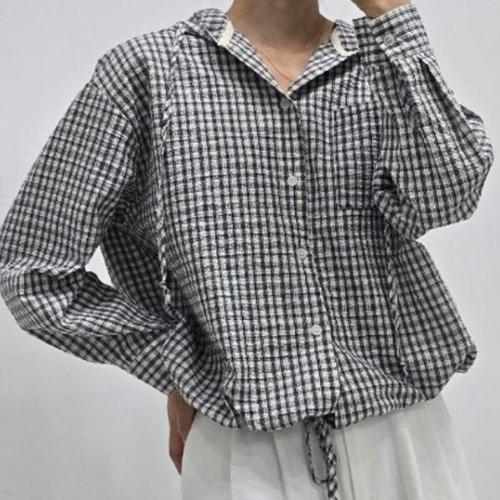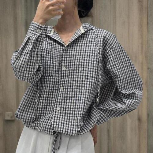 [신상오픈런]여성 체크 후드 크롭 남방 시어서커 스트랩 디자인