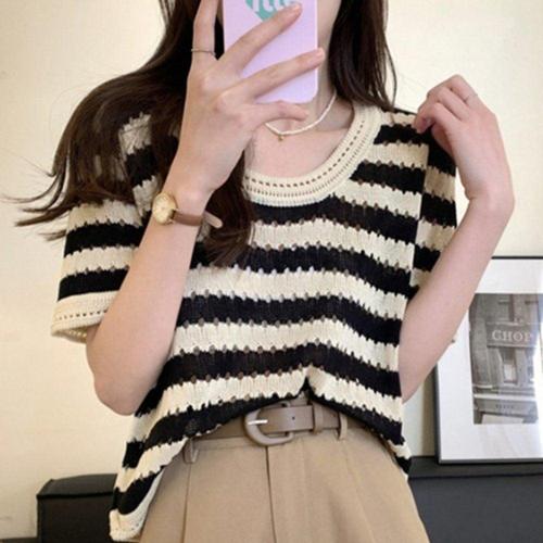 시원한 여성 펀칭 배색 스트라이프 반팔 니트 티셔츠 WE2559B