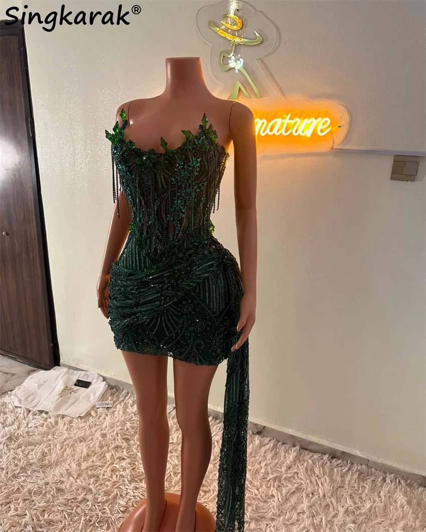 에메랄드 그린 크리스탈 비딩 시니어 홈커밍 프롬 드레스 미니 칵테일 가운 생일 드레스 럭셔리 2026 블랙걸 맞춤 제작