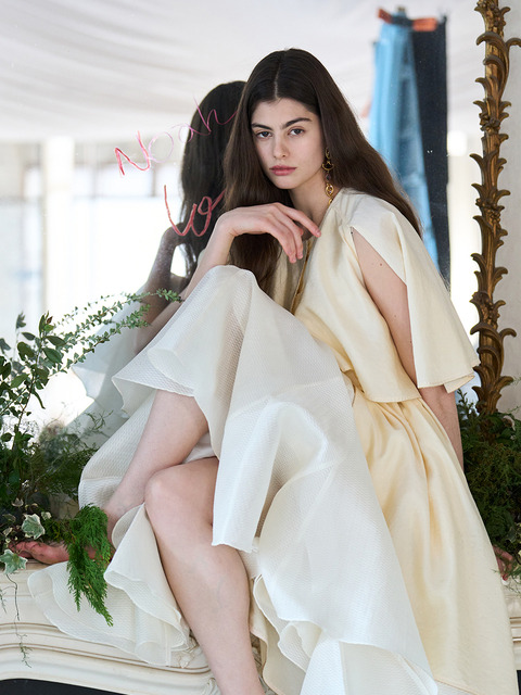[까이에] [까이에]컷아웃 케이프 슬리브 언밸런스 실크 트렌치코트_바닐라