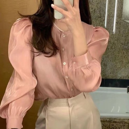 [신상오픈런]시스루 롱셔츠 긴팔 실키 메탈릭 샤인 봄블라우스