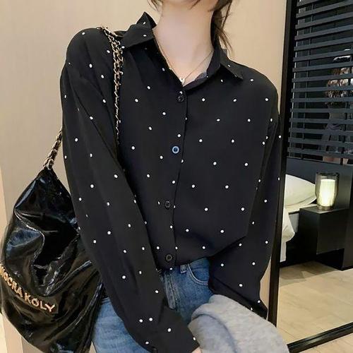 [에이치플러스몰]여성 심플 도트 블라우스 셔츠 카라넥 루즈핏 출근룩