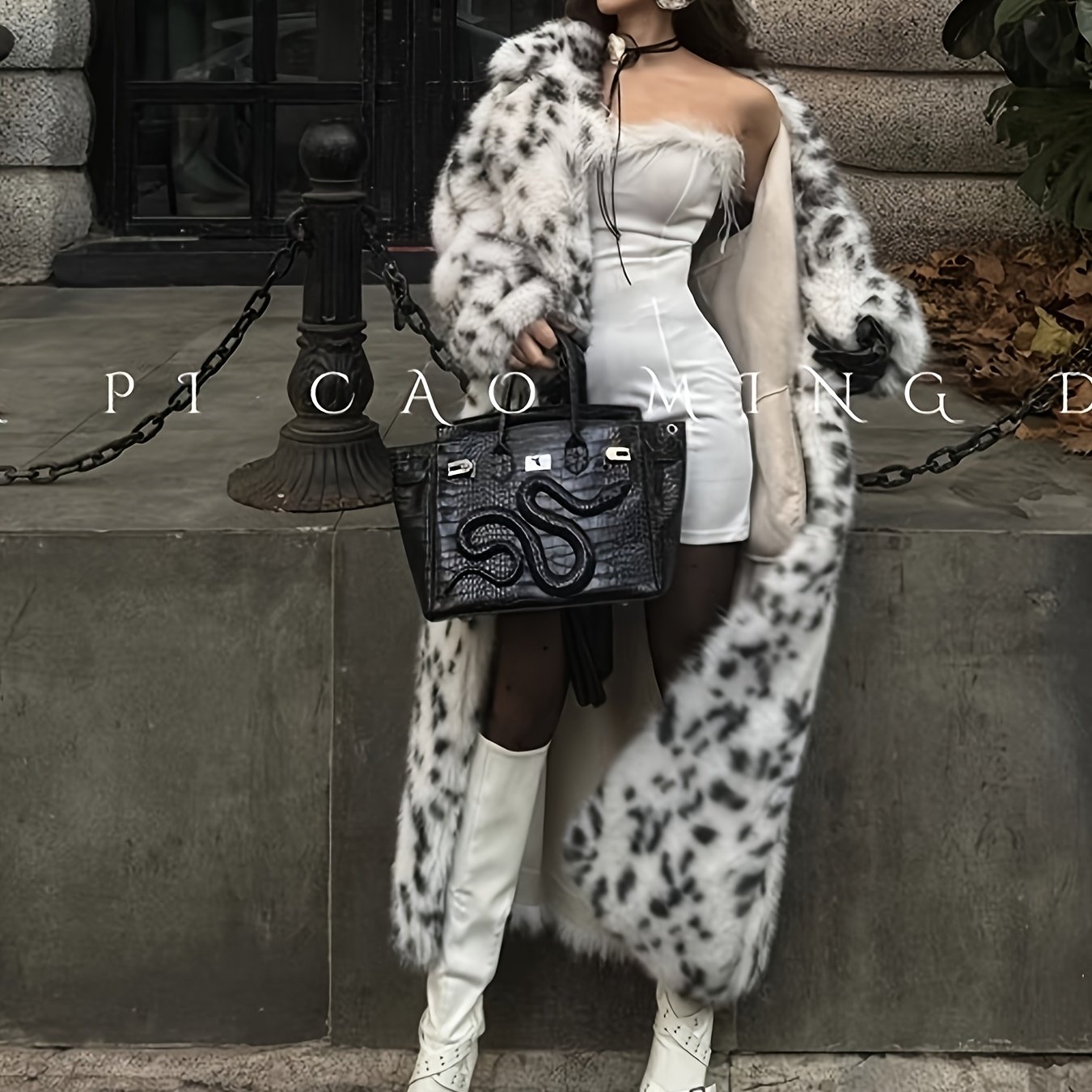 TEMU 여성용 인조 코트, 린스 패턴 인조 여우 두꺼운 롱 프린트 코트, 수트 칼라, 겨울 루즈 패셔너블 트렌디 스타일