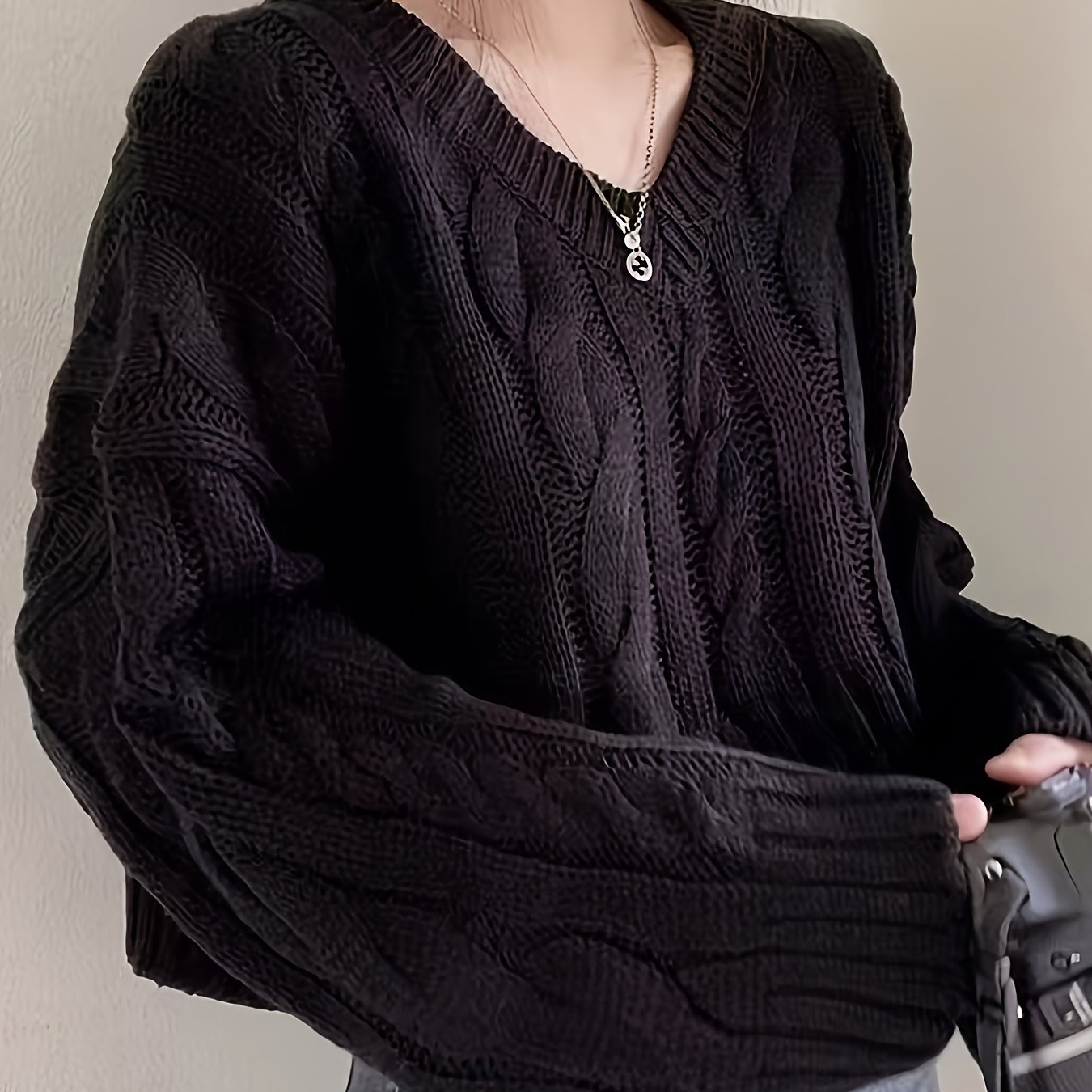TEMU 여성용 편안한 V넥 케이블 스웨터 - 긴 소매, 루즈핏, 솔리드 오렌지, 캐주얼 가을/겨울 풀오버, 찢어진 디테일, 캐주얼 겨울복 | V넥 스웨터 | 건축, 스웨터 드레스, 여성용 아름다운 스웨터, 좋은 블라우스, 여성용 V넥 칼라 스웨터, 여성용 블랙 V넥 스웨터, 우아한 블랙 스웨터