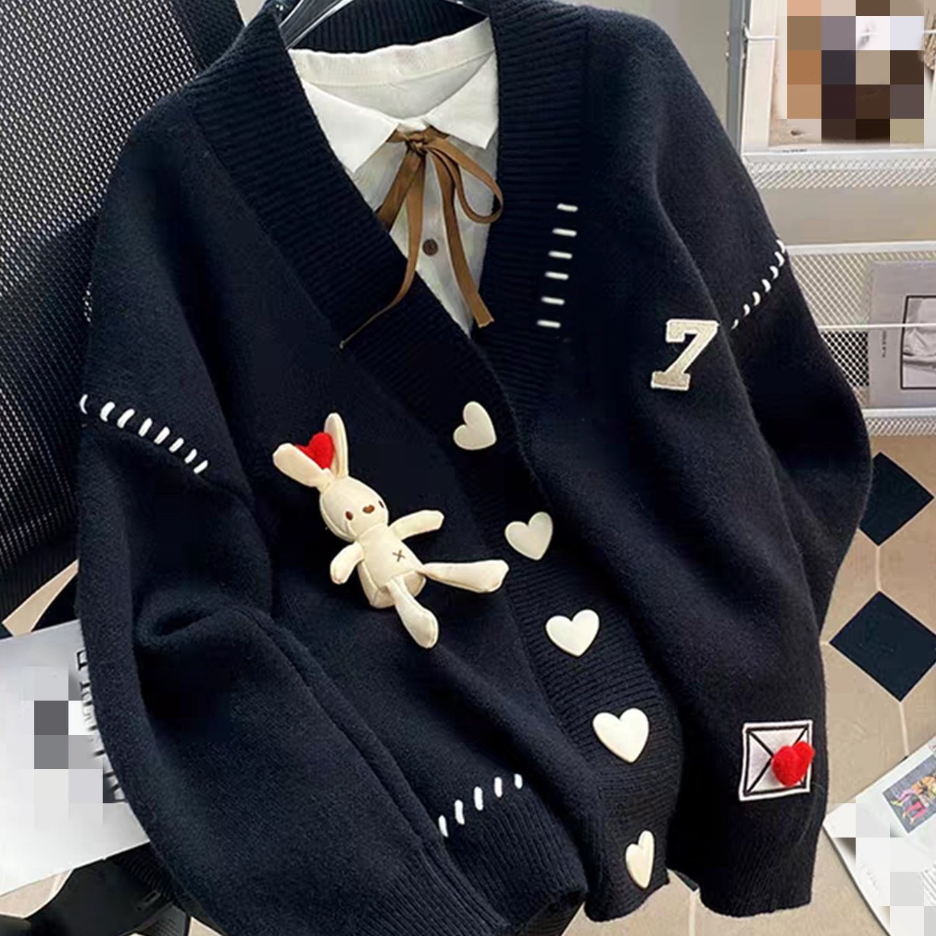 TEMU V넥 컬러 블록 아크릴 카디건, 니트 원단, 하트와 곰 디테일, 모든 계절에 어울리는 버튼 장식 스웨터