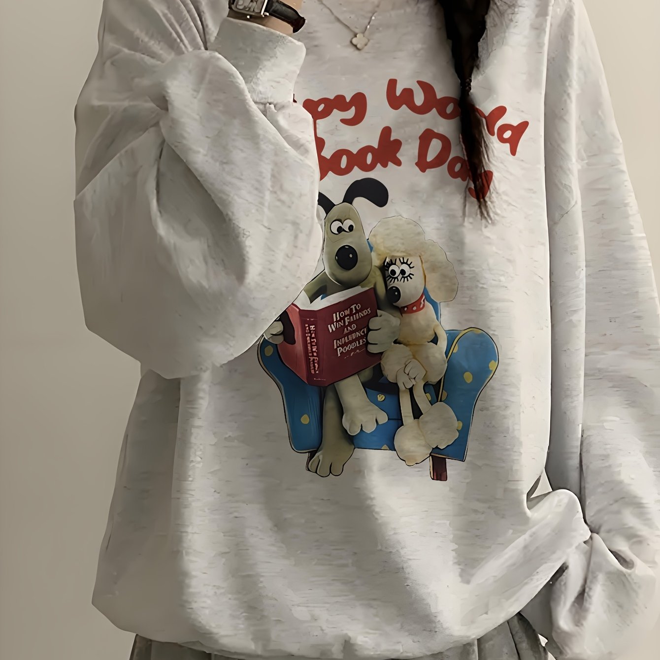 TEMU 여성용 Y2K 한국식 북 테마 오버사이즈 스웨트셔츠 - 해피 워드 북 데이 & 강아지 프린트, 회색 루즈핏 스웨터, 책 애호가를 위한 포근한 가을 겨울 캐주얼 스웨터 (흰색 베이스에 빨간 글자)