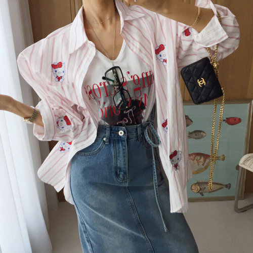 아이미마인 / 미니미 캣자수 배색 스트라이프 카라 루즈핏 간절기 봄 셔츠남방 (2color)
