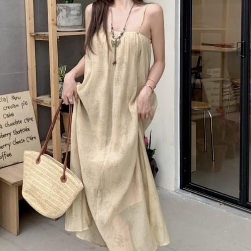 [옷자락]여성 아이보리 패턴 핀턱 끈나시 셔링 롱 원피스