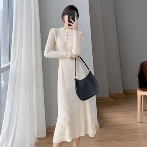 [오너클랜]인기상품 골지 프릴넥 니트 롱 원피스 A라인 블랙 아이보리 사선 패턴 스커트 [WFLIOGM_260301]
