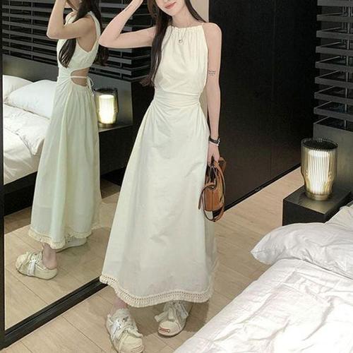 [에이치플러스몰]여성 아이보리 홀터넥 롱 원피스 민소매 바캉스