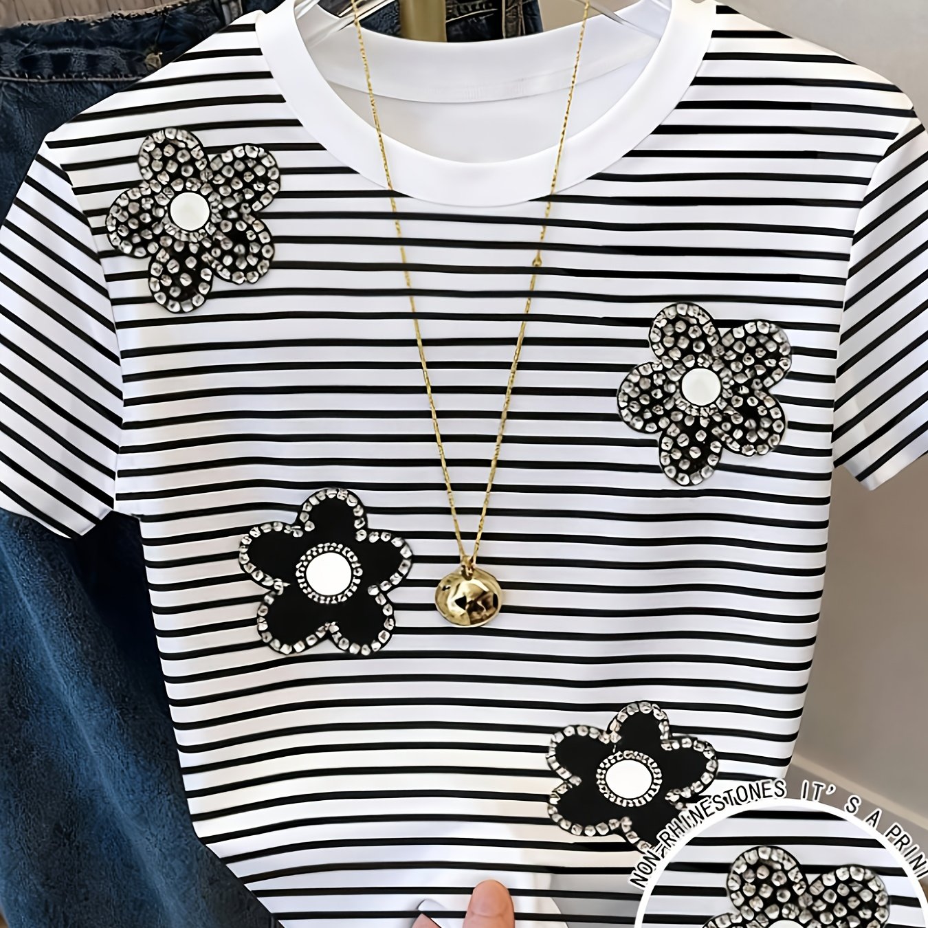 TEMU 여성용 플로럴 장식 캐주얼 라운드넥 반팔 티셔츠, 여름 스타일