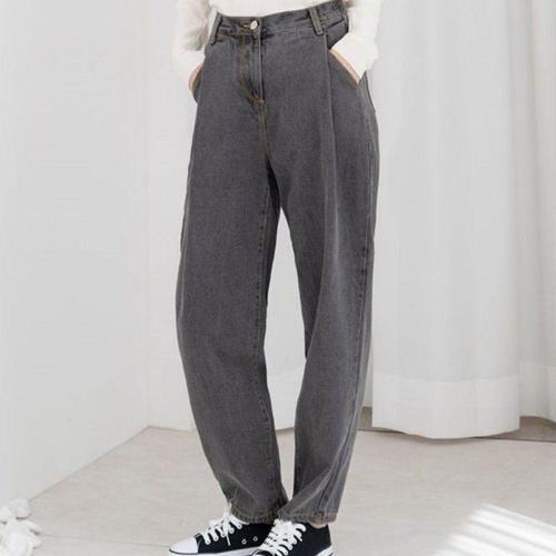 여자 그레이 핀턱 오버핏 뒷밴딩 배기 데님 청바지