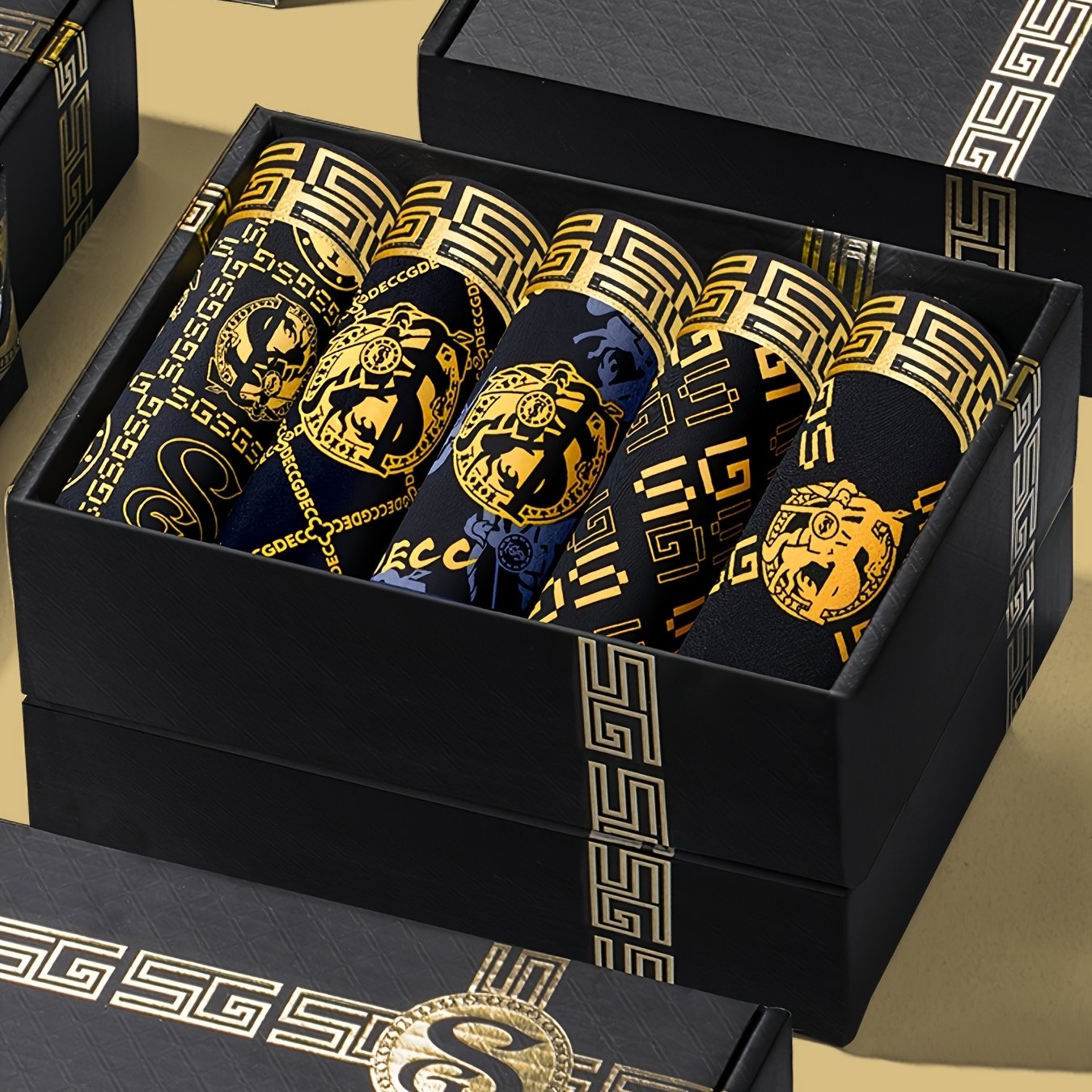TEMU 여름용 아이스 실키 섬유 초박형 편안한 통기성 부드러운 실키 스트레치, 블랙 골든 나이트 체인 디자인, 남성용 박서 브리프, 선물용 5개 세트