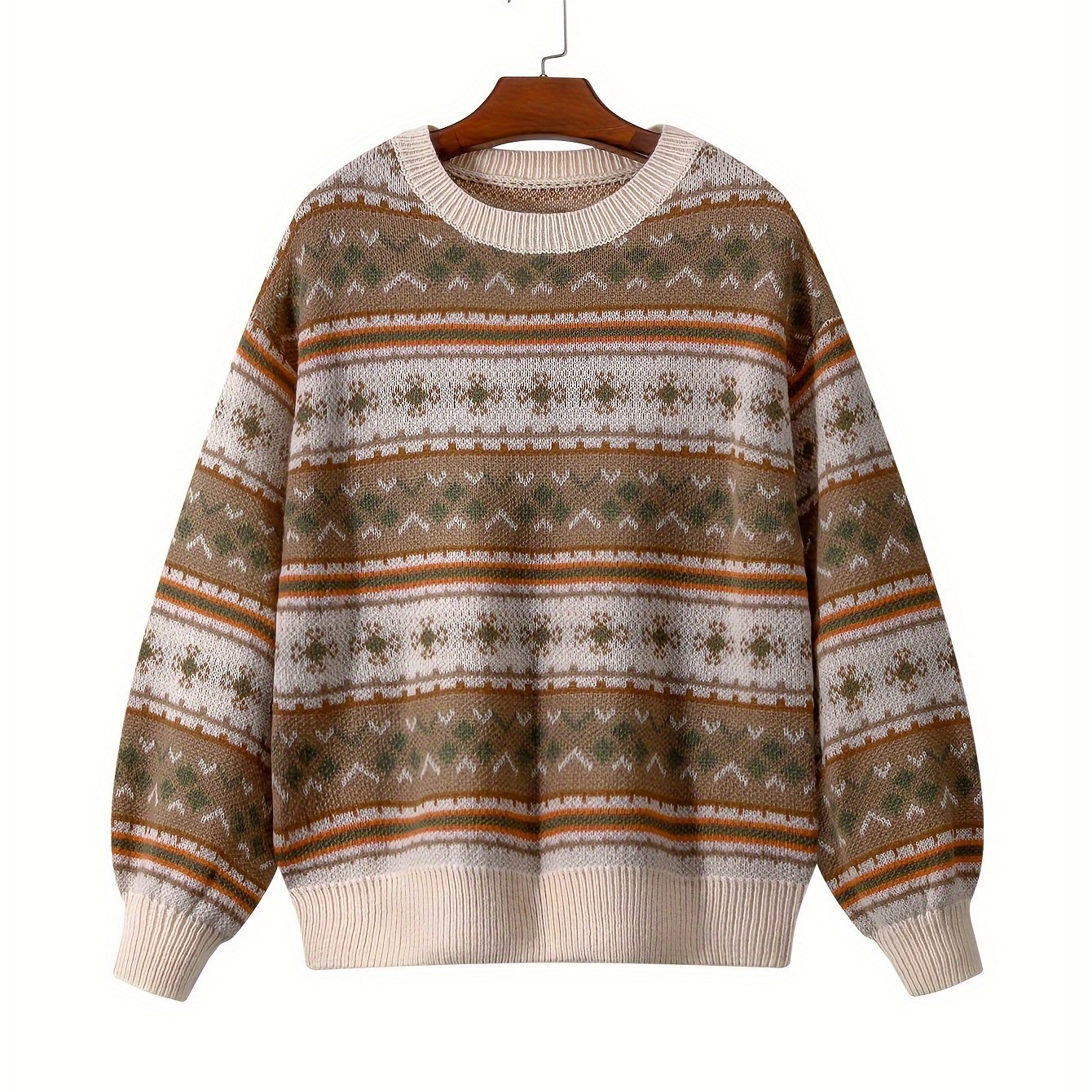 TEMU 지오 패턴 롱슬리브 스웨터, 캐주얼 크루넥 스웨터 겨울 & 가을, 여성 의류