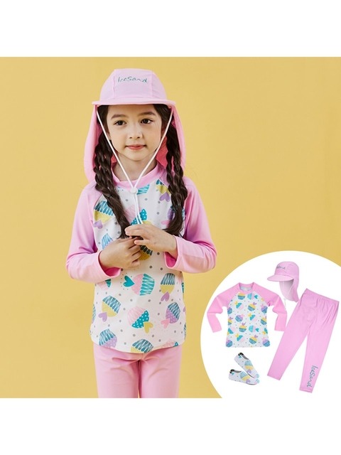 [아이스샌드] 아이스샌드 키즈 유아 여아동래쉬가드 5피스세트 (상의+하의2+플랩캡+아쿠아슈즈) BR-881113K