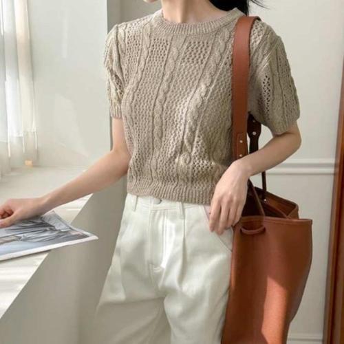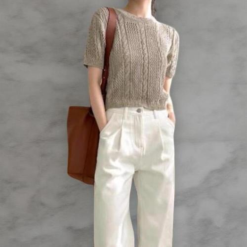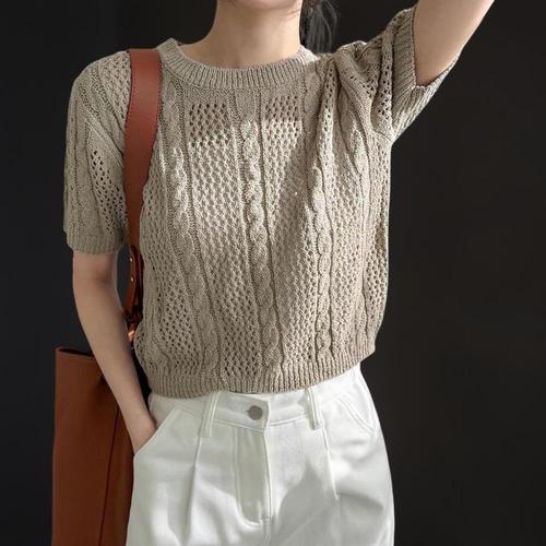 [옷자락]여성 아크릴 라운드넥 꽈배기 스카시 세미크롭 반팔 니트