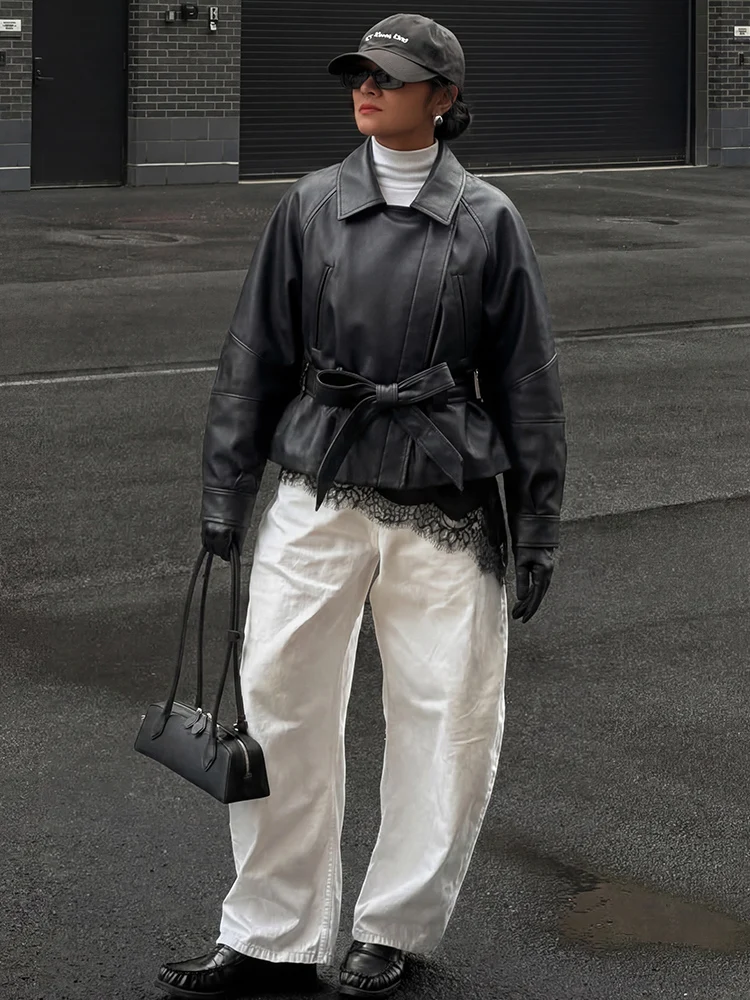 2025 신상 여성용 스플릿 양가죽 블레이저 재킷 패션 오피스룩 시크 싱글 버튼 레이스업 벨트 캐주얼 슬림 가죽 코트