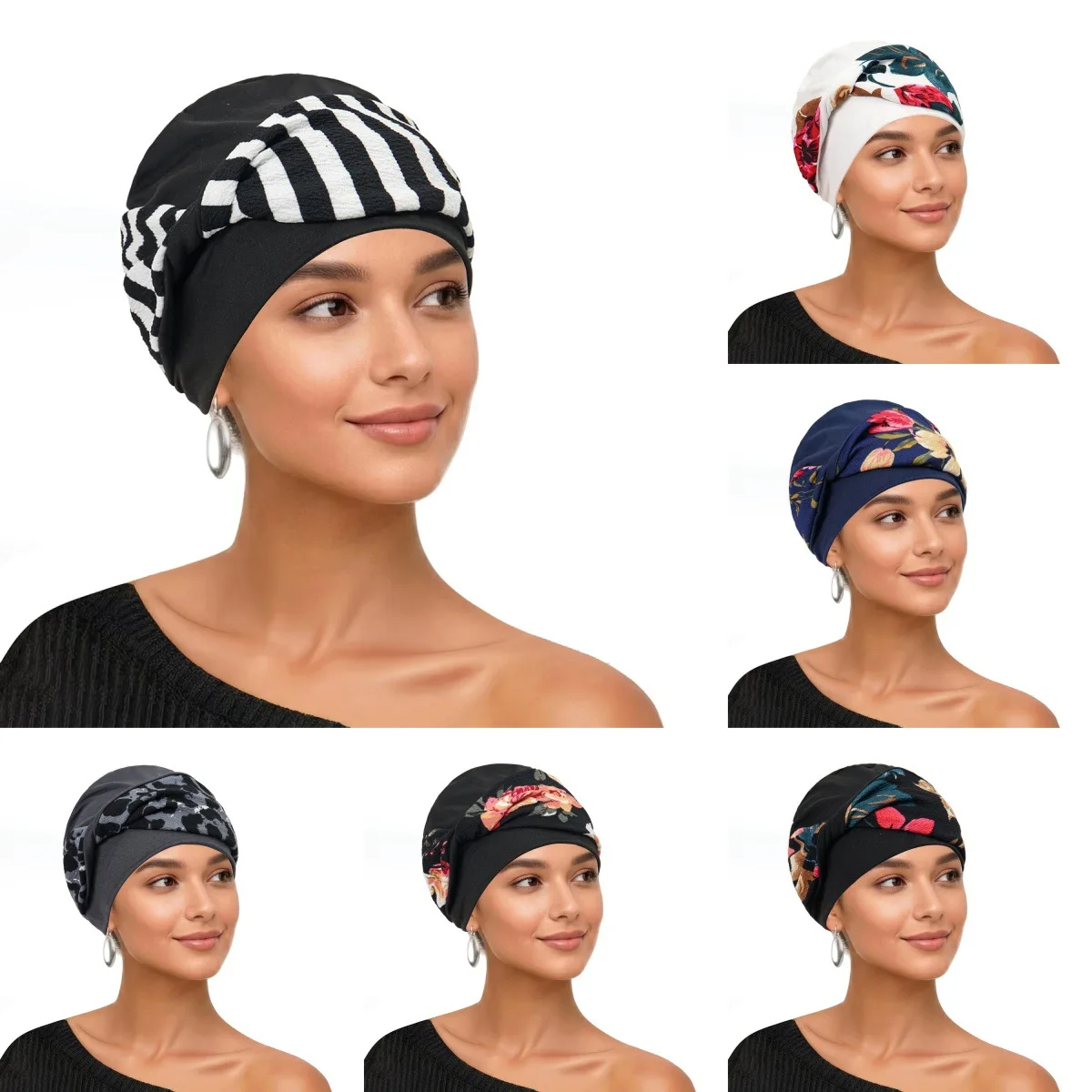 트렌디한 무슬림 여성용 부드러운 스트레치 터번 모자, 미리 묶인 헤드스카프, 패션 프린트 히잡, 반다나, 항암치료용 비니, 캡 커버