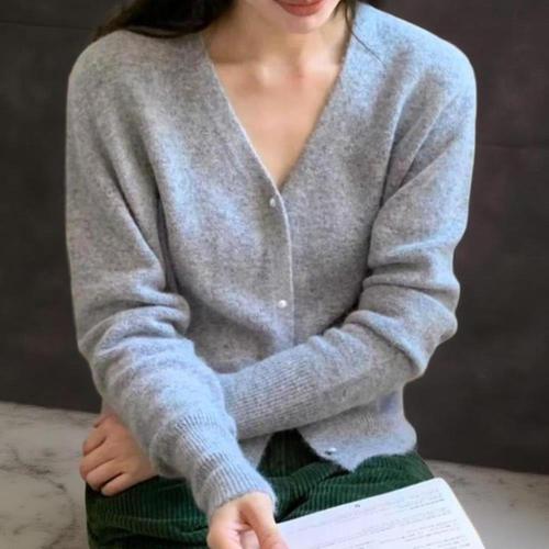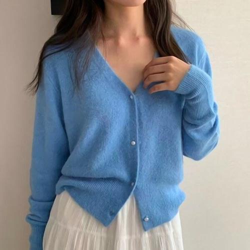 [다잇템]여성 V넥 스웨터 앙고라 엷은 카디건 진주버튼