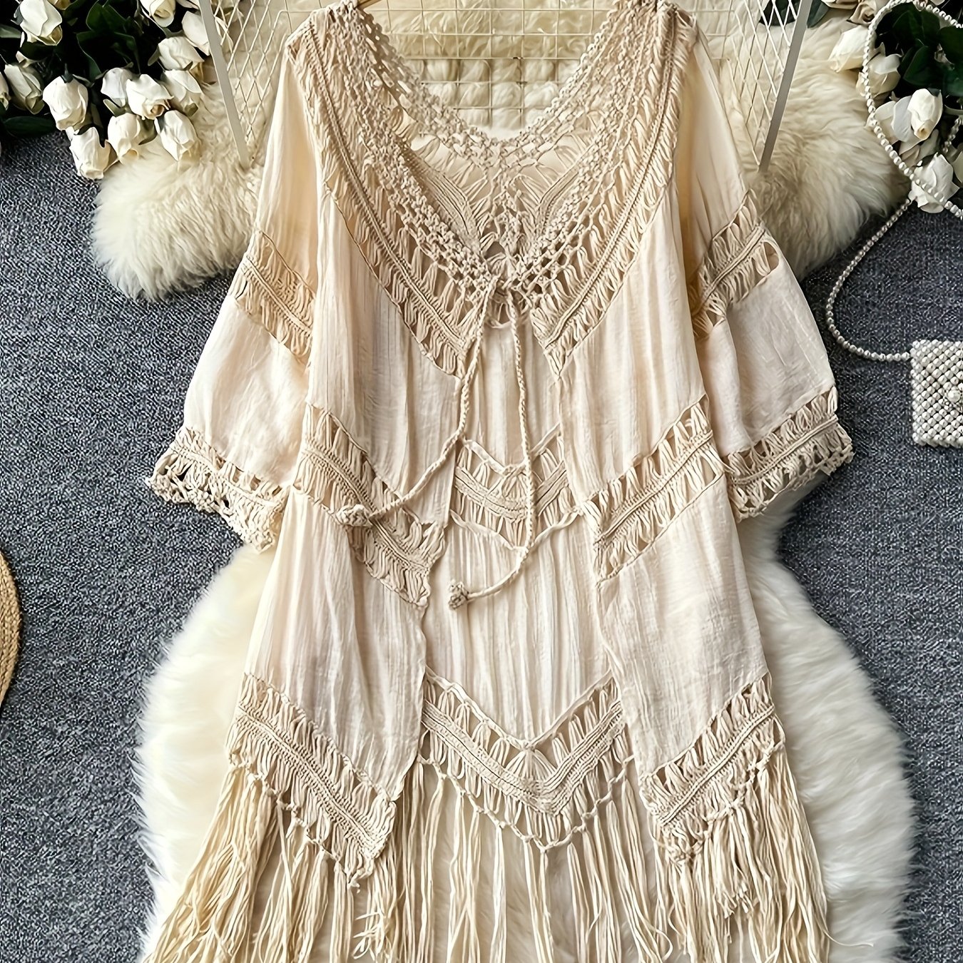 TEMU 여성 비치 커버업, 손뜨개 레이스 롱 가디건, 가벼운 캐주얼 태슬 셔츠
