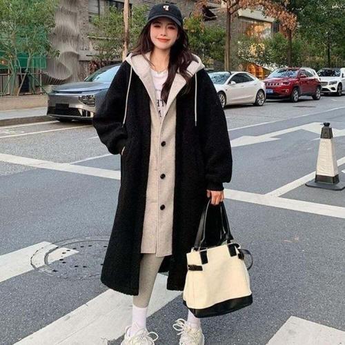 [위드기프트]오버핏 양털 블랙 레이어드 후드 롱코트
