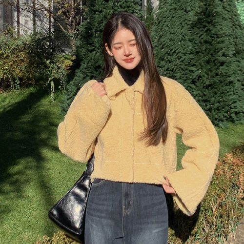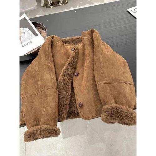 Modern Fashion 여성 털 숏 자켓 스웨이드 라운드넥 양털 무스탕