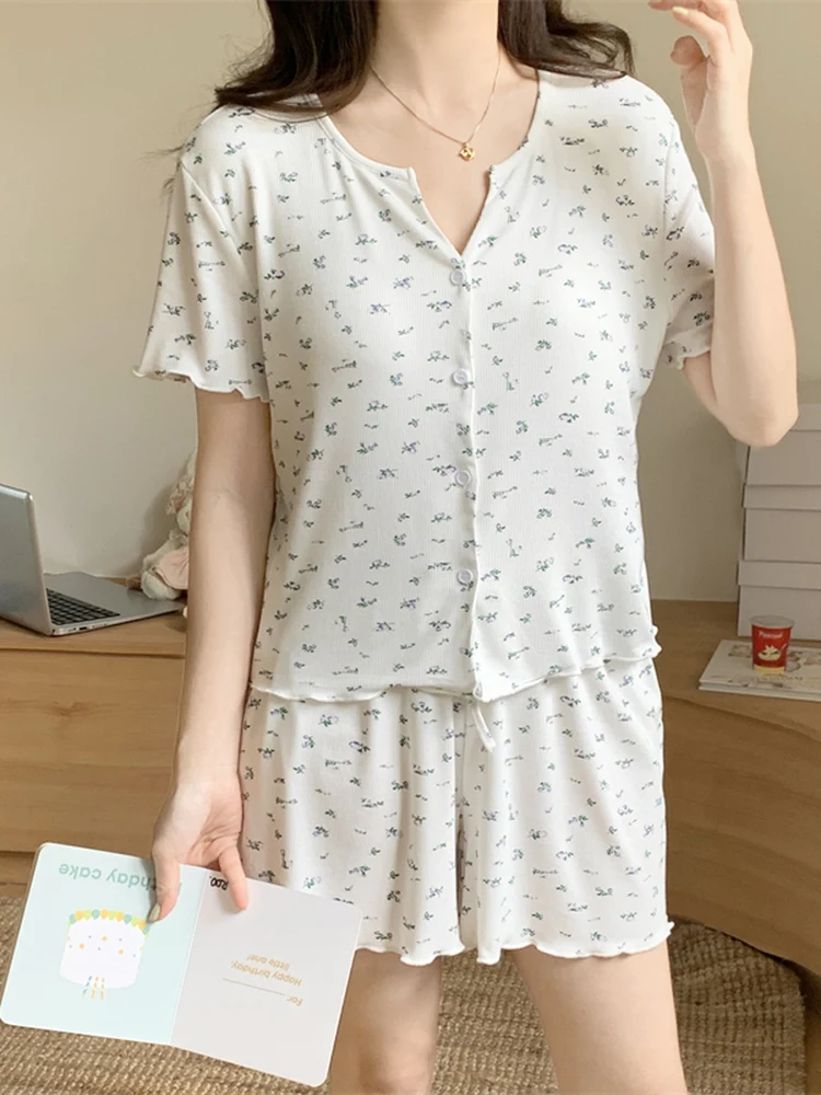 달콤한 꽃무늬 여성용 잠옷 반팔 홈웨어 세트 가슴 패드 포함 한국 스타일 여름 캐주얼 폴리에스터 원단