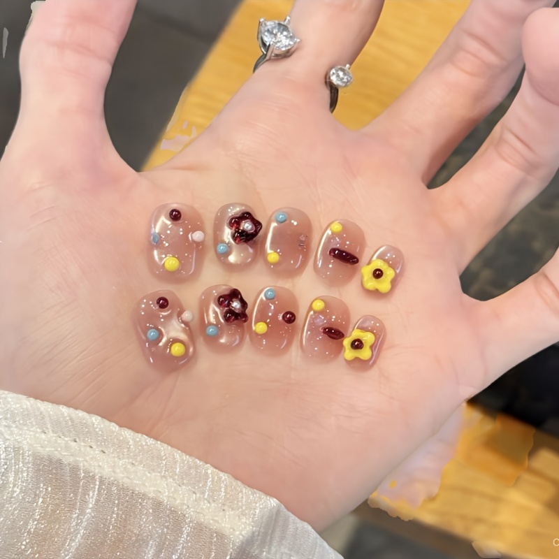 TEMU 10개입 핑크 블러쉬 옴브레 캣아이 귀여운 카툰 젤리 텍스처 인조네일, 컬러풀 비즈 & 작은 꽃 장식, 반짝이는 광택 데일리 데이트용 네일