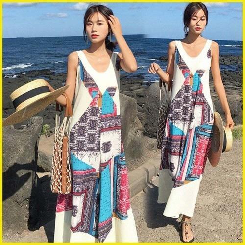 [다잇템]여자 여름 에스닉 스모크밴딩 끈나시 롱원피스