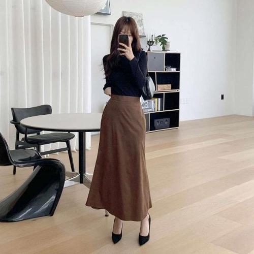 POMTOR 여성 가을 겨울 치마 A라인 슬림라인 리본 디테일 롱 스커트