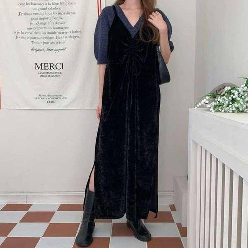 하객 롱니트 쉬폰 스트랩 프릴 여름 여성 데님 WFKNXPD