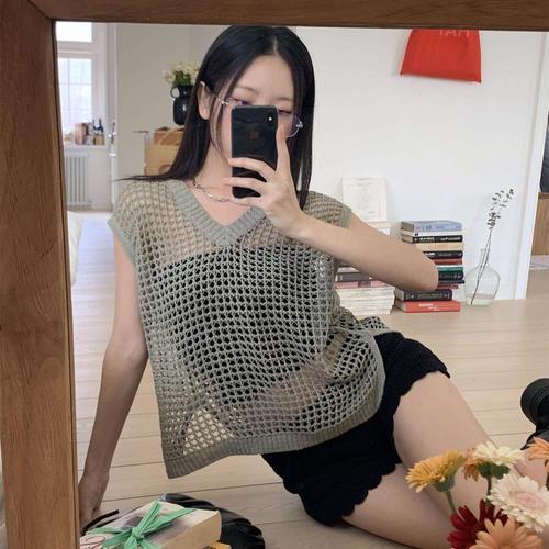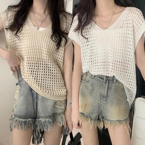 여자 펀칭 니트 조끼 여름 브이넥 민소매 베스트 크롭