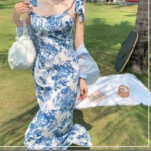 여성 여름 어깨 끈묶음 플라워 롱원피스 꽃무늬원피스 (KYR-WDBFDE8)