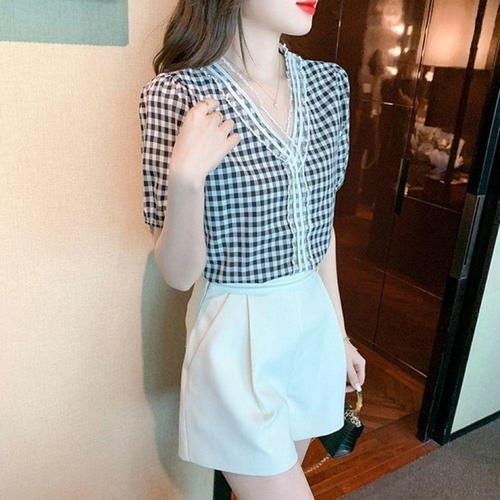 여성 여름 반팔 브이넥 셔링 체크 블라우스 브라우스