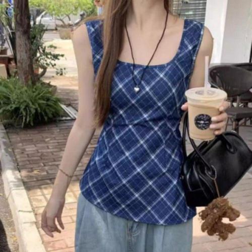 [옷은날개] 여성 민소매 블라우스 체크 나시 등파임 여름 슬리브리스