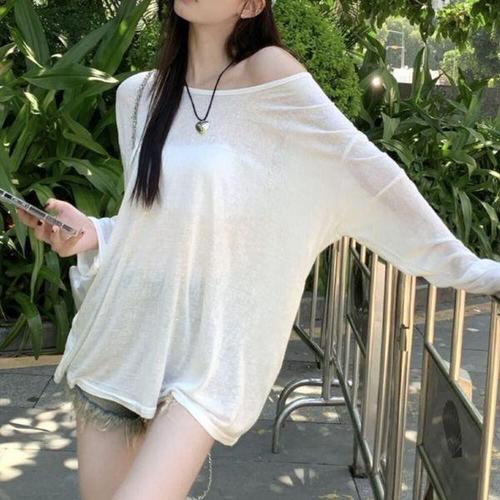 [에이치플러스몰]여성용 유넥 루즈핏 여름 티셔츠 시스루 얇은 긴팔 티