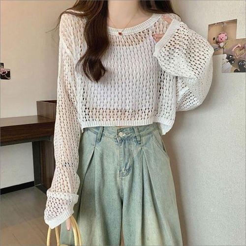 [에이치플러스몰]그물니트 루즈핏 펀칭 커버업 여성 긴팔 티셔츠 여름니트