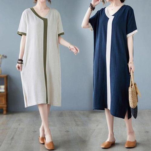 [오너클랜]인기상품 여성용 린넨 루즈핏 반팔 배색 롱원피스 여름 드레스 [WFLLBEI_260304]