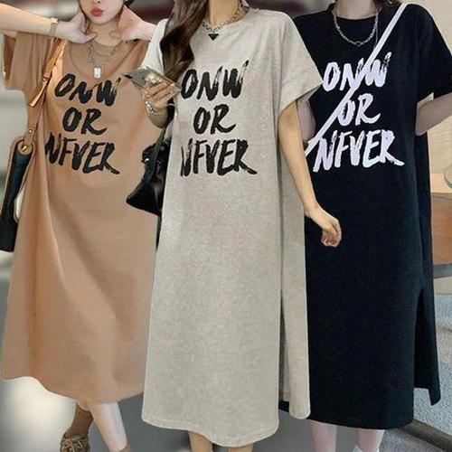 (땡처리 특가상품) 150kg까지 빅사이즈 1+1 여성 줄무늬 옆트임 반팔 티셔츠 원피스 여름 편한 루즈핏 박스 날씬해보이는 심플 베이직 배색 부드러운 데일리 캐쥬얼 외출용 원피스