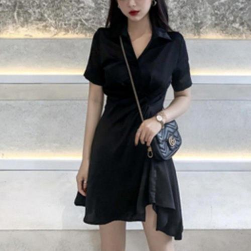 [오너클랜]인기상품 화이트 배색 카라 반팔 쉬폰 블랙 스커트 원피스 여름 셔츠 스타일 [WFLL0BZ_260304]