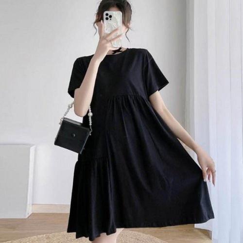 중년여성 순색 라운드 반팔 면마원피스 빅사이즈 캐주얼 루즈핏 심플 린넨원피스 데일리 편안한 치마
