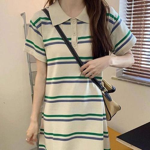[셀러허브_여성트랜드패션]ONM 스트라이프 배색 원피스 반팔카라 여성 여름 꾸안