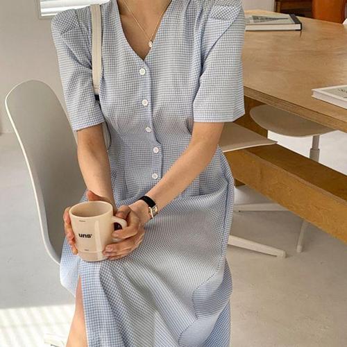 브이넥 체크 퍼프소매 원피스 여름 데일리 롱핏